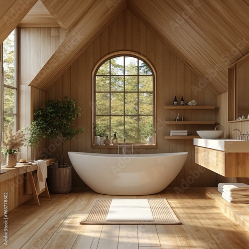 Modern Wooden Bathroom with Freestanding Bathtub and Window View