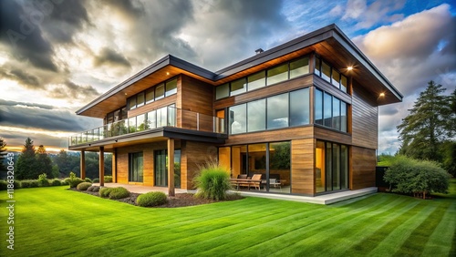 Modern Wooden House, Expansive Lawn, Large Windows - Stock Photo