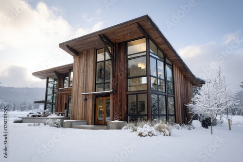 wooden, house, snow, winter, architecture, large, window, mountain, serene, early, morning, nature, landscape, warm, glow, peaceful, modern, design, residential, environmental, cosy, snowy, scene, home, tranquil, scenery, rural, tree, glasses, style, sunlight, area, atmosphere, rustic, minimalist, surrounding, front, yard, beautiful, fresh, living, cold, weather, natural, material, building, wood