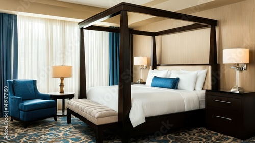 Modern wood-themed bedroom with subtle cream walls, bold furniture, and vivid blue accents