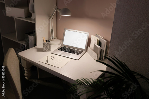 background, blank, business, colours, comfortable, computer, copy, dark, deadline, design, desk, device, equipment, evening, freelance, glowing, indoor, interior, cyberspace, lamp, laptop, late, light, modern, monitor, night, nobody, object, office, online, overwork, place, screen, space, stationery, stylish, supply, table, technology, template, text, trendy, wall, work, working, workplace