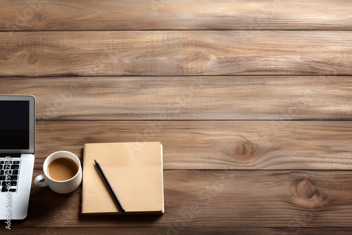 Modern workplace with laptop, notepad and coffee cup on wooden table top view background. High quality photo