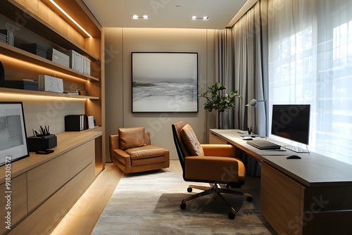 Modern workspace featuring a cozy chair and stylish office setup in neutral tones.
