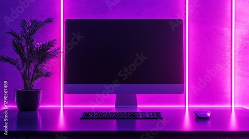 workspace, monitor, purple, light, keyboard, desk, pen, holder, modern, design, technology, nocturnal, minimalism, computer, setup, ambient, lighting, office, work, productivity, sleek, electronic, creative, space, shadow, furniture, stylish, contemporary, aesthetic, illumination, clean, line, essential, silhouette, home, decor, night time, digital, professional, elegant, organisation, cable, workstation, accessory, environment, sharpened, inspiration, remote, relaxation