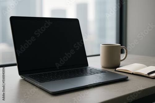 Modern workspace setup with laptop, coffee mug, and notebook on desk near window with city buildings in soft background light. Ai generative.