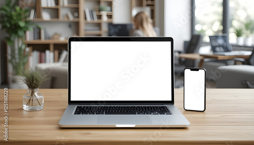 workspace, laptop, smartphone, blank screen, technology, device, contraption, minimalistic, contemporary, innovation, portable, wireless, connectivity, high technology, electronic device, office space, workplace