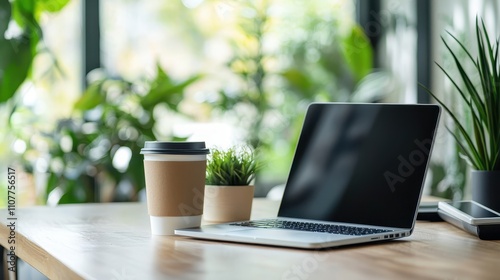 Modern workspace with laptop, coffee cup, and plants on a wooden desk. Bright and airy office scene with natural light and greenery.