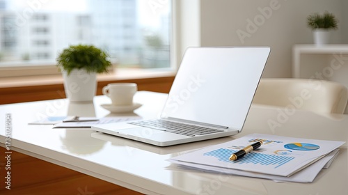 Modern Workspace with Laptop, Coffee, Notepad, and Business Charts in Bright Office Environment