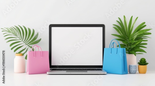 Modern Workspace with Laptop, Colorful Shopping Bags, Green Plants, and Creative Background for Business Use