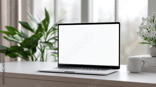organisation, simplicity, calmness, inspiration, clarity, office, blank screen, contemporary, elegance, productivity, coffee cup, computer, desk, laptop, interior, greenery, plant, home office, stylish, technology, modern, workspace, clean, daylight, lifestyle, design, minimalism, home decor, white background, bright, nature, fresh flower