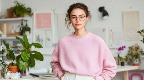woman, pink, sweater, office, plant, stylish, modern, young, goggles, workspace, interior, design, casual attire, confident, independent, creative, contemporary, aesthetic, trendy, greenery, decor, desk, professional, entrepreneur, lifestyle, portrait, natural, urban, current, soft, feminine, cosy, minimalist, atmosphere, smart, relaxed, expression, vibrant, fresh, sharpened, scene, elegant, bright, organised, indoor, lighting, arrangement