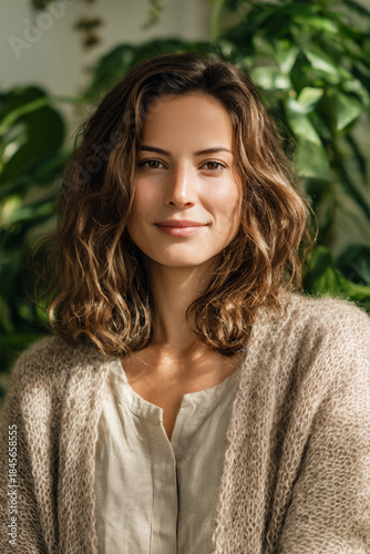 Modern Young Woman Portrait with Warm Smile, Casual Linen Outfit, Natural Light Background