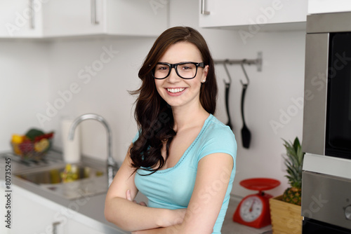 woman, kitchen, house, home, home, food, fruit, fresh, healthy, girl, spectacle, hipster, facility, furniture, contented, laid back, lifestyle, fun, fun, t-shirt, diet, person, man, female, caucasian, smile, young, curl, 20s