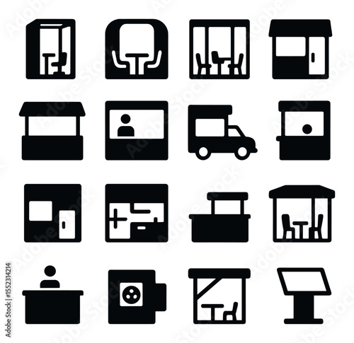 modular, commercial, space, icon, silhouette, solid, black, office, booth, co, working, pod, conference, room, unit, module, retail, kiosk, shape, clean, filled, simple, service, counter, drive, window, security, checkpoint, warehouse, storage, shared, pantry, section, cashier, desk, seating, enclosure, reception, zone, utility, bay, canopy, extension, interactive, display