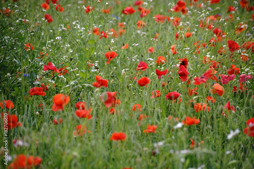 red poppy, papaver, poppy, cornflower, meadow, fence, meadow, flower, flower, nature, plant, flora, topview, close-up view, sunlight, colourful, colourful, flower, green, red, white