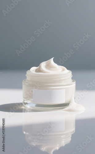 Moisturizer cream overflowing slightly on the edge of a glass jar with blank label