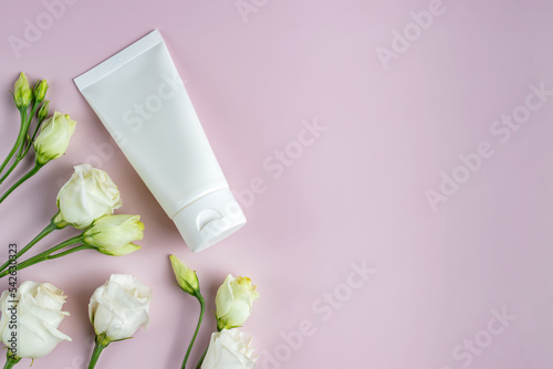 Moisturizer hand cream white plastic tube mockup on pink trandy background with eustoma flowers. Blank skin care beauty product packaging