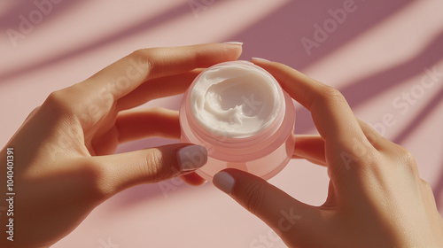Moisturizing cream in hand for dry winter skin care, Winter hydrating cream held in hand with soft pink background. Cosmetic shot, beauty industry advertising photo.