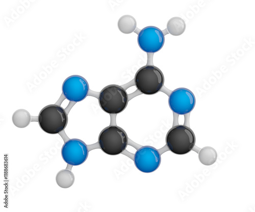 Molecule of Adenine. Group of vitamins B4. Molecular formula: C5H5N5. Chemical model: Ball and Stick. Isolated. Transparent background. PNG. 3D illustration.