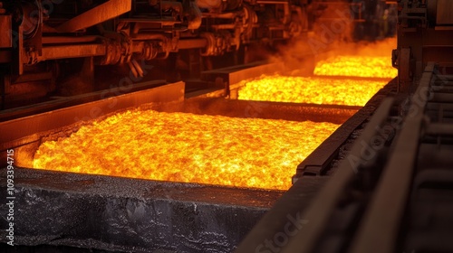 molten, metal, processed, steel, manufacturing, facility, glowing, orange, hue, intense, heat, flowing, liquid, industrial, production, craftsmanship, technology, machinery, fabrication, dynamic, vibrant, energy, foundry, smelting, factory, no people