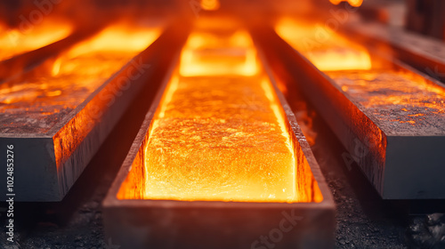 Molten metal flowing in an industrial environment, showcasing the intense heat and raw power of metal production.