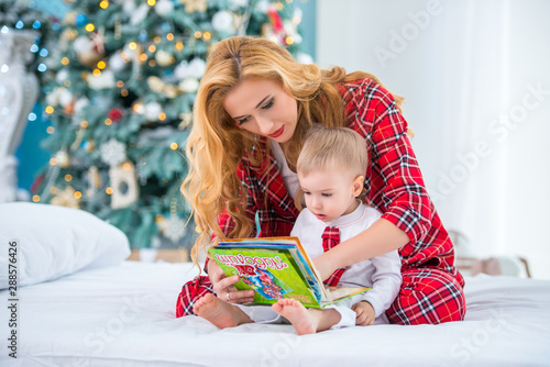 Mom and son in checkered pajamas are sitting on the bed and reading a book of New Year's tales together