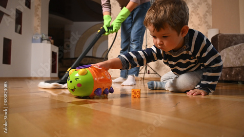 Mom does the cleaning while the child plays. Child plays on the background of cleaning