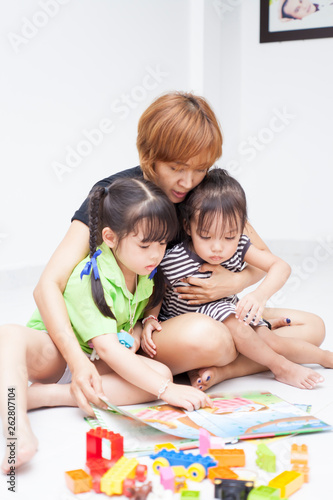 Mom is reading comic book with her daughters