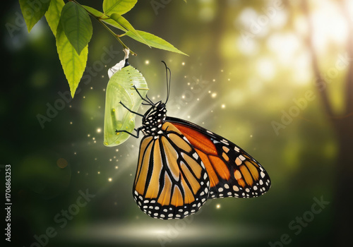 Monarch butterfly emerges from chrysalis in magical sunlit forest