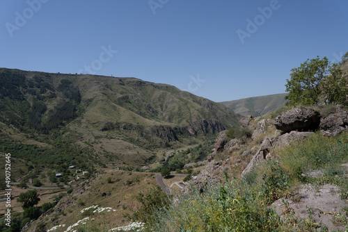 monastery in the mountains of georgia where there are caves and passages along the mountain, above them there is a blue sky.