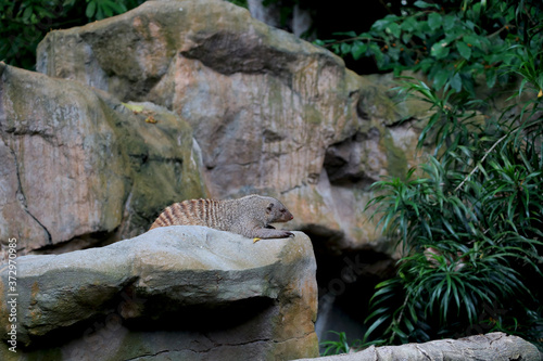 mongoose is sitting on rock blur background