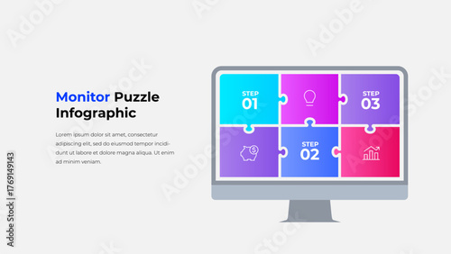 Monitor Puzzle Infographic. Business Strategy Diagram for Data Analysis, Management, and Process Visualization in Gradient Colors