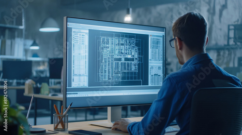 Monitor screen featuring an architectural blueprint plan draft sketch, part of a modern office workstation. Engineer creating construction project design, employing workplace techn