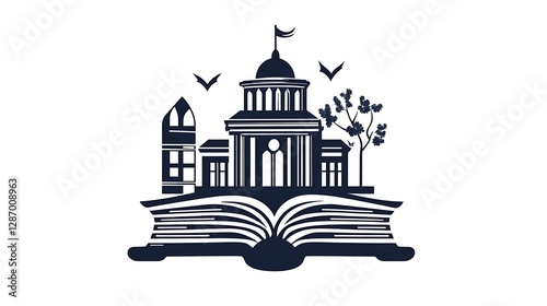 education, cognition, learning, literacy, wisdom, book, library, school, college, university, city, town, building, architecture, city landscape, open book, page, dome, flag, bird, tree, silhouette, design, graphic, illustration, vector