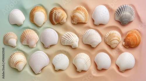 Monochromatic Seashells Artistically Arranged on Smooth Pastel Sand Evoke Tranquility and Beach Vibes