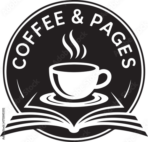 monochrome, black, white, illustration, graphic, design, emblem, logotype, symbol, icon, badge, circle, round, frame, cup, mug, beverage, hot, steam, drink, saucer, book, open, page, reading, literature, cognition, education, learning, study, library, bookshop, cafes, relaxation, comfort, cosy, leisure, lifestyle, intellectual, concept, culture, storytelling, hobby, quiet, passion, inspiration, contemplation, vintage, silhouette