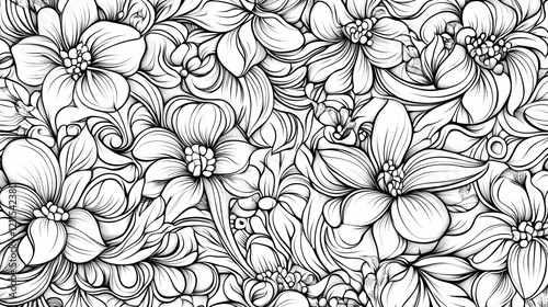 Monochrome floral pattern, intricate line art, nature design, seamless repeat, textile print