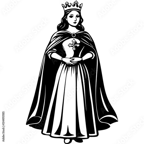 queen, monochrome, illustration, regal, crown, gown, dress, royals, royalty, cloak, cape, female, woman, standing, full body, black-and-white, line art, graphic, vector, drawing, art, design, symbol, icon, fashion, clothing, apparel, portrait, elegant, majestic, historical, vintage, fantasy, mythical, power, authority, graceful, star, pattern, fabric, long hair, beauty, formal, traditional, white background, isolated, detailed, character, costume