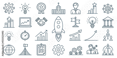 startup, innovation, icon, set, monochrome, line, vector, success, rocket, growth, business, idea, strategy, leadership, launch, light bulb, chart, trophy, plan, progress, achievement, development, graph, gear, entrepreneurship, performance, creative, isolated, flat, solution