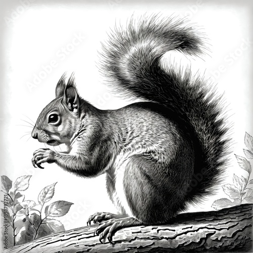 squirrel, monochrome, black-and-white, animal, rodent, tree, tree branch, fur, tail, wildlife, nature, forest, timberland, mammal, closeup, detail, drawing, vignetting, vintage, classic, elegant, design element, cute, charming, wild animal, arboreal, climbing, claw, nut