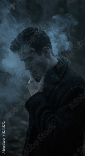 man, smoking, smoke, portrait, pensive, dark, moody, mysterious, coat, cinematic, person, male, photogenic, young, adult, cigarette, thinking, sad, contemplative, profile, overcoat, black, atmospheric, dramatic, lonely, solitude, stress, serious, sombre, addiction, habit, unhealthy, face, cool, nicotine, tobacco, character, book, cover