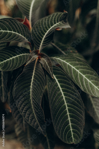 Moody close-up of tropical foliage with elongated dark green leaves featuring prominent light veins and subtle red accents at the stems.