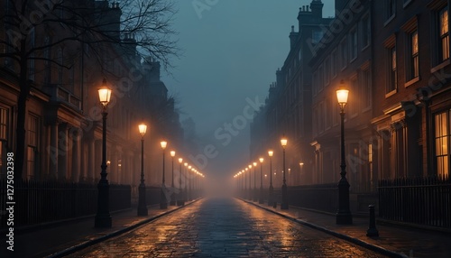 Moody evening illustration of Victorian London street with glowing gaslights. Row of historic buildings with illuminated windows line road vanishing into fog. Perfect for themes of history,