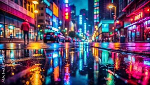 Moody rainy night cityscape with blurred neon lights and wet pavement reflecting vibrant colors, creating a mystical atmosphere of urban isolation.