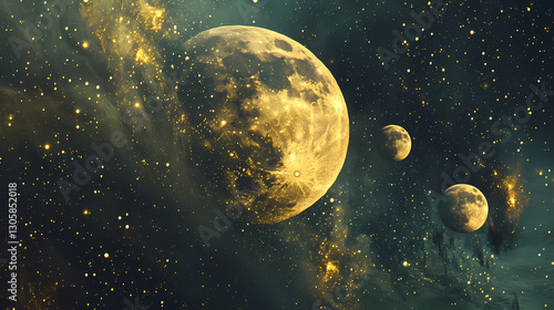 illuminated, moon, phase, sparkling, starry, night, double, exposure, mystical, representation, lunar, cosmic, harmony, celestial, illustration, galaxy