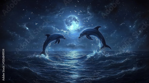 dolphin, leap, night, moon, ocean, starry, sea, jumping, animal, wildlife, celestial, romantic, magical, beautiful, nature, illustration, digital, art, fantasy, love, couple, underwater, water, wave, splash, blue, sky, cloud, moonlight, night sky, ocean life, artistic, magic, fantasy art, happy, excited, silhouette, digital artwork, dream, dreamy