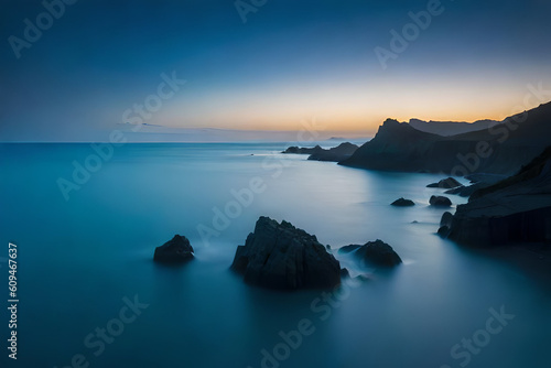 Moonlight in ocean landscape. The ocean stretches out as far as the eye can see, its surface a canvas of deep, midnight blue. AI generated image Generative AI