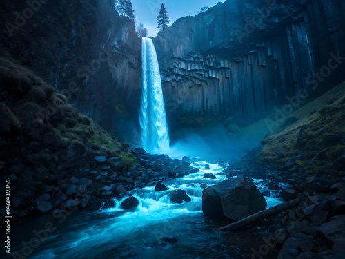 Moonlit waterfall cascading into a rocky pool surrounded by dark basalt columns – Cascada iluminada por la luna que fluye hacia una poza rocosa rodeada de columnas de basalto oscuro