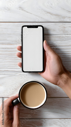 smartphone, hot drink, mug, wooden, table, hand, drink, break, morning, technology, device, screen, blank, display, digital, mobile, phone, cup, beverage, latte, cappuccino, breakfast, relax, comfort, warmth, cosy, home, desk, office, work, lifestyle, minimal, simple, modern, overhead, topview, white, background, texture
