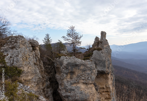 morning in a natural park, mountainous area panorama of a mountain range with forest and vegetation
